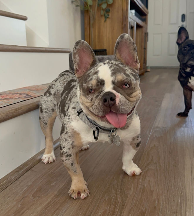 I live with my foster parents, their two resident dogs, and one other foster Frenchie. My best friend is definitely my foster mom. She takes such good care of me, teaching me how to be a good girl and how to navigate around the house like a pro. I love to follow her around wherever she goes!
